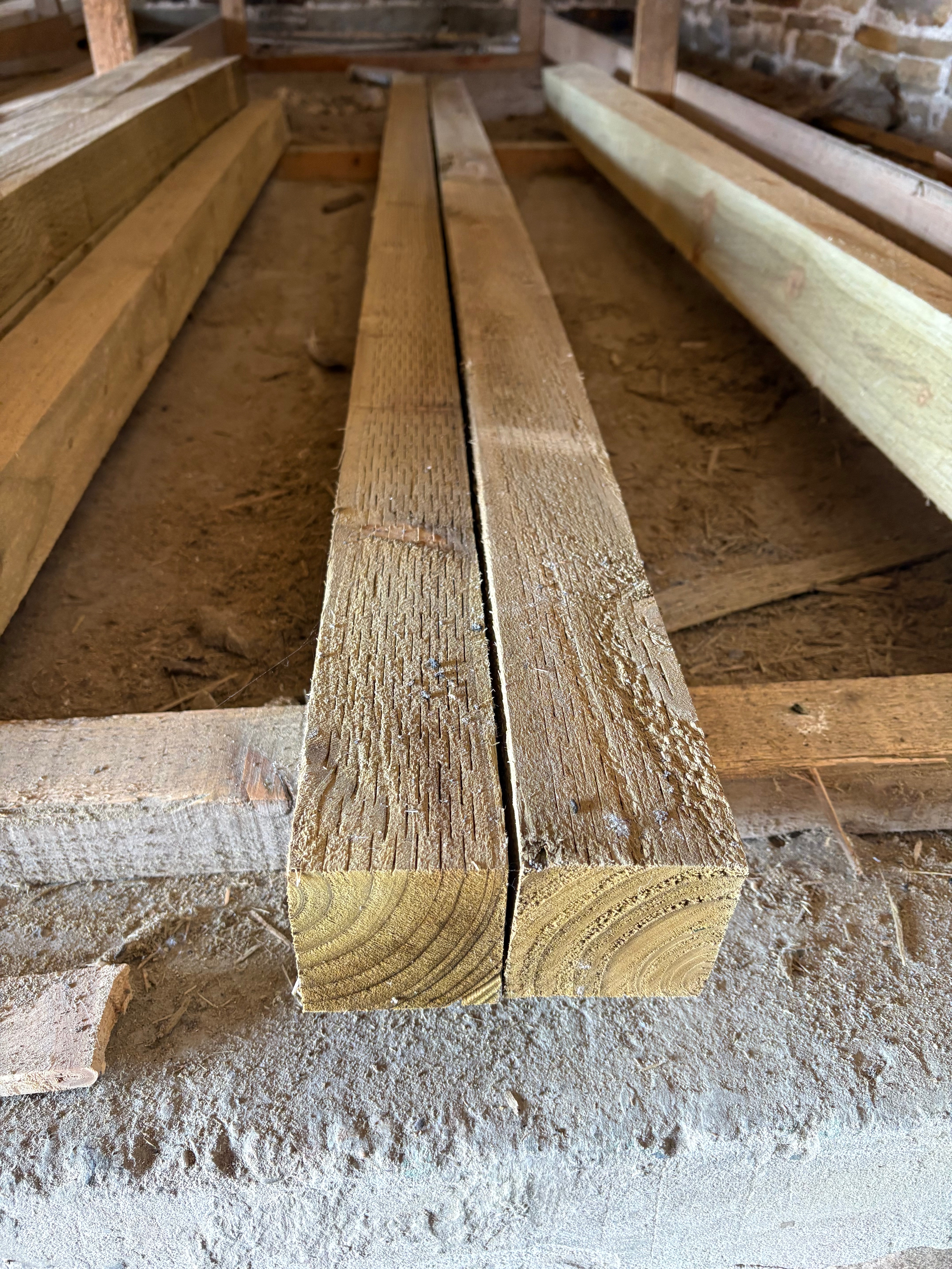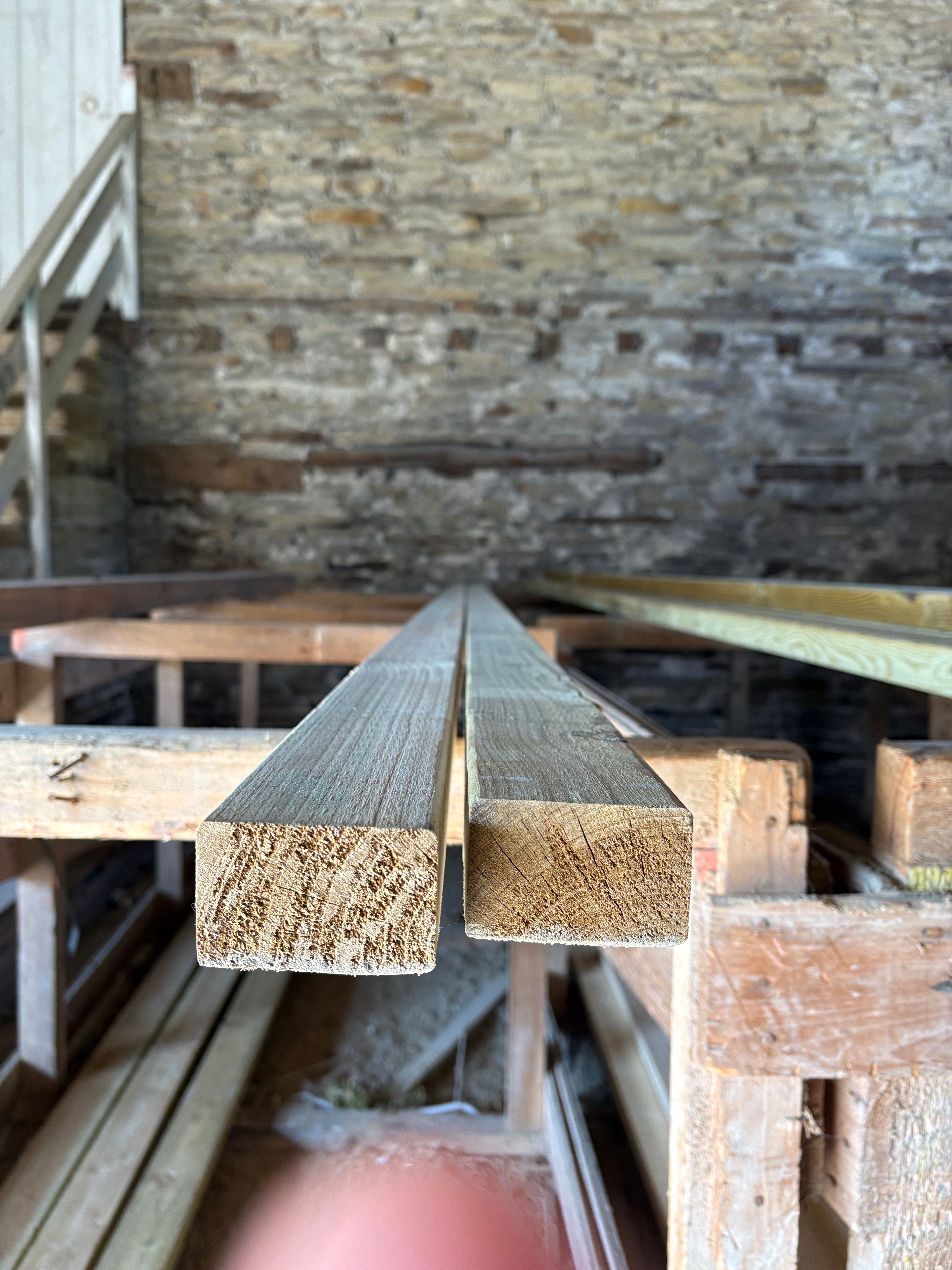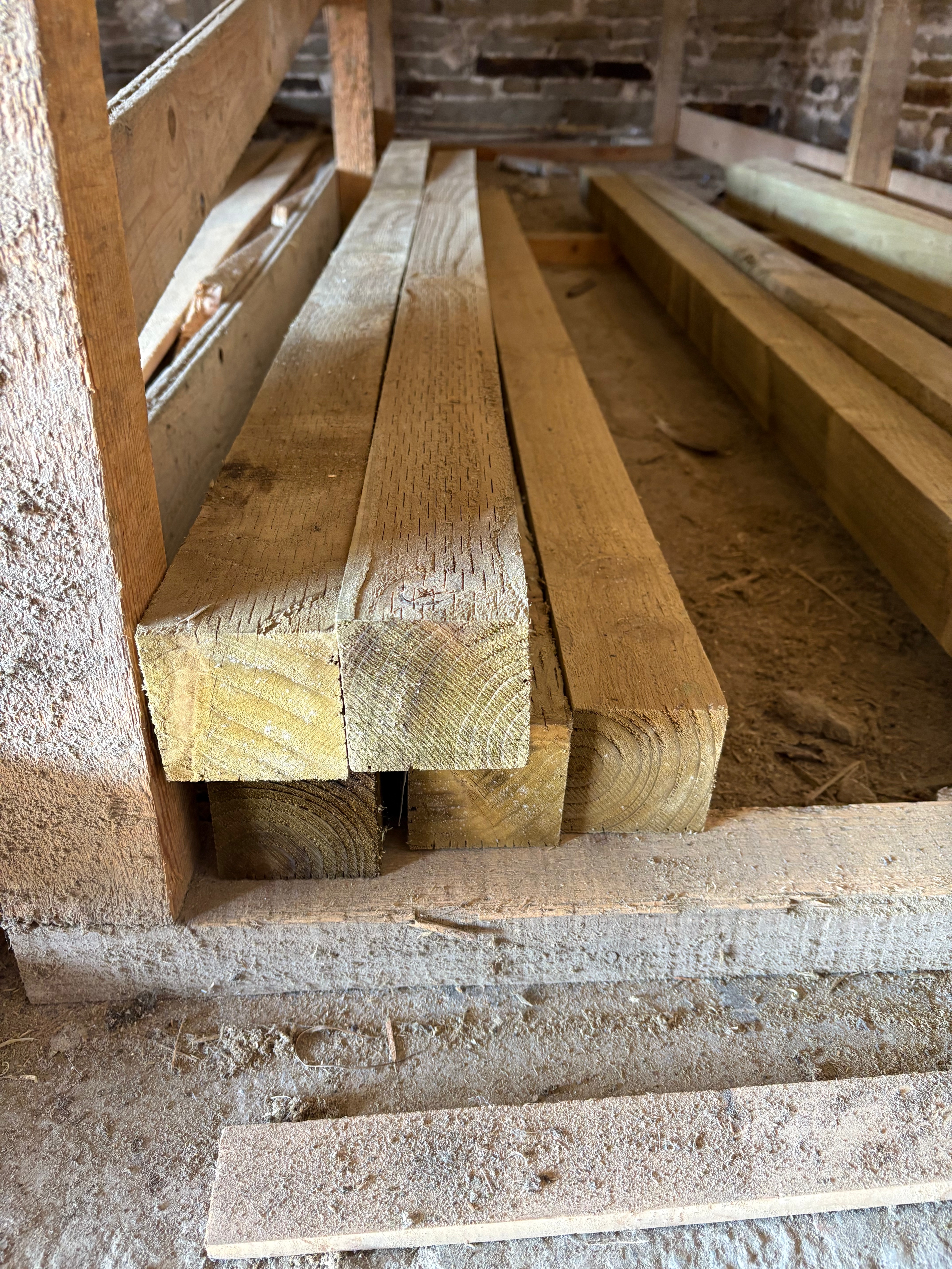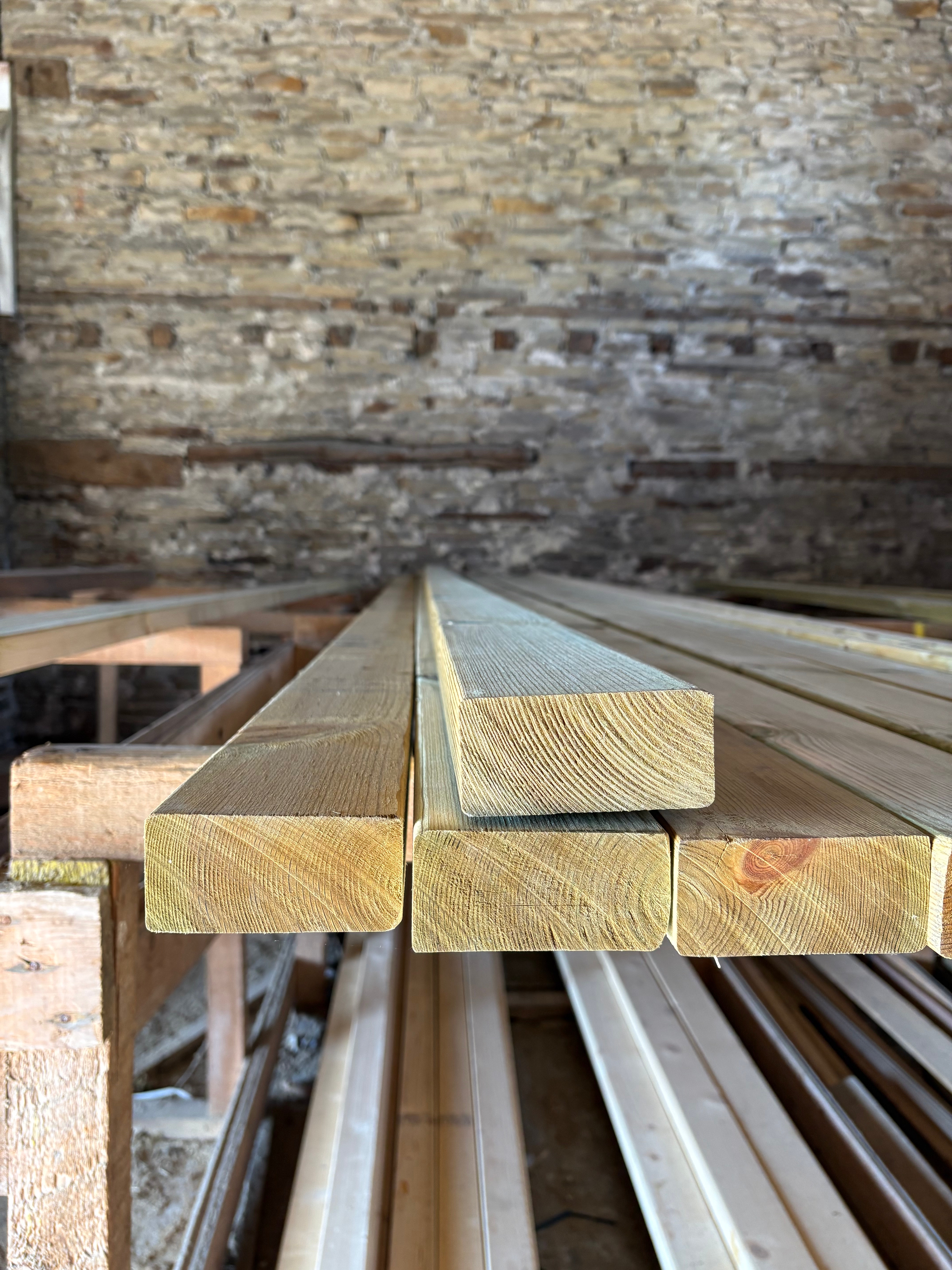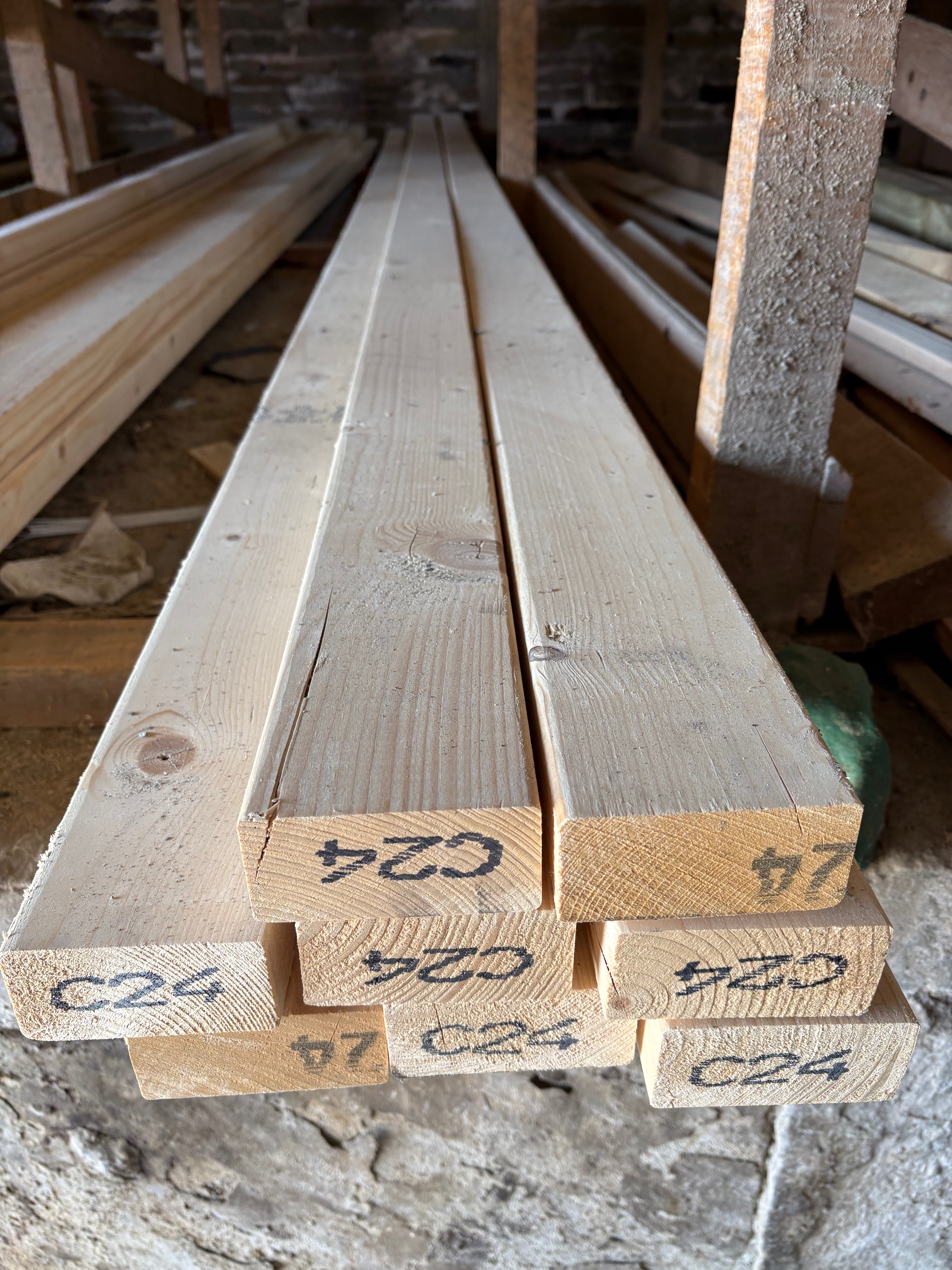 Lengths of 4”x2” (47x100mm) sawn timber, used for construction of walls etc. 4.8m lengths.